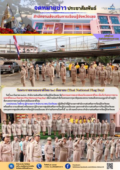 วันที่ ๒๘ กันยายน ๒๕๖๖ สำนักงานส่งเสริมการเรียนรู้จังหวัดเลย จัดกิจกรรมเคารพธงชาติและร้องเพลงชาติไทย เนื่องในวันพระราชทานธงชาติไทย ๒๘ กันยายน (Thai National Flag Day) เพื่อร่วมน้อมรำลึกในพระมหากรุณาธิคุณของพระบาทสมเด็จพระมงกุฏเกล้าเจ้าอยู่หัวที่ทรงพระราชทานธงไตรรงค์เป็นธงชาติไทย