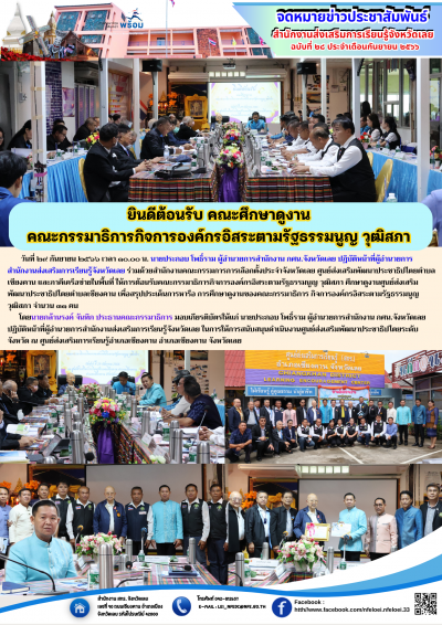 วันที่ ๒๙ กันยายน ๒๕๖๖ เวลา ๑๐.๐๐ น. นายประกอบ โพธิ์ราม ผู้อำนวยการสำนักงาน กศน.จังหวัดเลย ปฏิบัติหน้าที่ผู้อำนวยการสำนักงานส่งเสริมการเรียนรู้จังหวัดเลย ร่วมด้วยสำนักงานคณะกรรมการการเลือกตั้งประจำจังหวัดเลย ศูนย์ส่งเสริมพัฒนาประชาธิปไตยตำบลเชียงคาน และภาคีเครือข่ายในพื้นที่ ให้การต้อนรับคณะกรรมาธิการกิจการองค์กรอิสระตามรัฐธรรมนูญ วุฒิสภา ศึกษาดูงานศูนย์ส่งเสริมพัฒนาประชาธิปไตยตำบลเชียงคาน เพื่อสรุปประเด็นการหารือ การศึกษาดูงานของคณะกรรมาธิการ กิจการองค์กรอิสระตามรัฐธรรมนูญ วุฒิสภา จำนวน ๓๑ คน