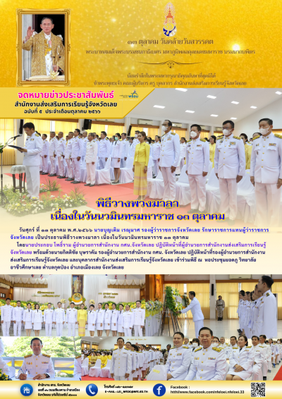วันศุกร์ ที่ ๑๓ ตุลาคม พ.ศ.๒๕๖๖ นายบุญเติม เรณุมาศ รองผู้ว่าราชการจังหวัดเลย รักษาราชการแทนผู้ว่าราชการจังหวัดเลย เป็นประธานพิธีวางพวงมาลา เนื่องในวันนวมินทรมหาราช ๑๓ ตุลาคม
