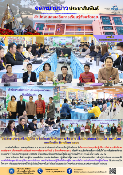 ระหว่างวันที่ ๑๖ - ๑๗ พฤศจิกายน พ.ศ.๒๕๖๖ สำนักงานส่งเสริมการเรียนรู้จังหวัดเลย จัดโครงการประชุมเชิงปฏิบัติการจัดทำแบบฝึกทักษะทางวิชาการ เพื่อยกระดับผลสัมฤทธิ์ทางการเรียน ภาคเรียนที่ ๒ ปีการศึกษา ๒๕๖๖ เพื่อสร้างแบบฝึกทักษะในการนำไปใช้ และเพื่อพัฒนาทักษะทางวิชาการให้กับนักศึกษา สกร.จังหวัดเลย ให้มีผลสัมฤทธิ์ทางการเรียนที่สูงขึ้น มีผู้เข้าร่วมโครงการรวมทั้งสิ้น จำนวน ๗๗ คน
