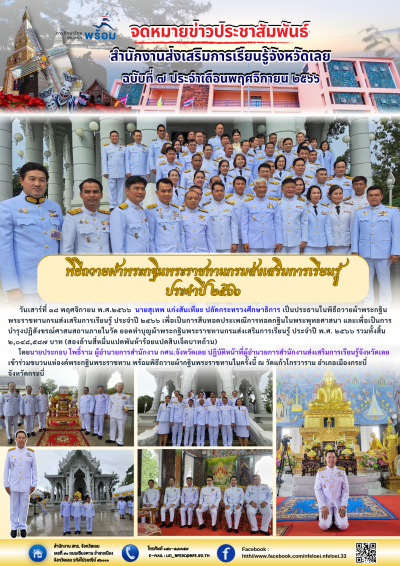 โดยนายประกอบ โพธิ์ราม ผู้อำนวยการสำนักงาน กศน.จังหวัดเลย ปฏิบัติหน้าที่ผู้อำนวยการสำนักงานส่งเสริมการเรียนรู้จังหวัดเลย เข้าร่วมขบวนแห่องค์พระกฐินพระราชทาน พร้อมพิธีถวายผ้ากฐินพระราชทานในครั้งนี้ ณ วัดแก้วโกรวาราม อำเภอเมืองกระบี่ จังหวัดกระบี่