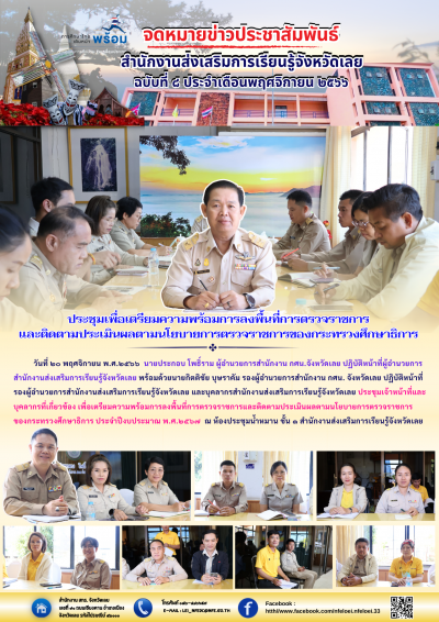 วันที่ ๒๐ พฤศจิกายน พ.ศ.๒๕๖๖ นายประกอบ โพธิ์ราม ผู้อำนวยการสำนักงาน กศน.จังหวัดเลย ปฏิบัติหน้าที่ผู้อำนวยการสำนักงานส่งเสริมการเรียนรู้จังหวัดเลย พร้อมด้วยนายกิตติชัย บุษราคัม รองผู้อำนวยการสำนักงาน กศน. จังหวัดเลย ปฏิบัติหน้าที่รองผู้อำนวยการสำนักงานส่งเสริมการเรียนรู้จังหวัดเลย และบุคลากรสำนักงานส่งเสริมการเรียนรู้จังหวัดเลย ประชุมเจ้าหน้าที่และบุคลากรที่เกี่ยวข้อง เพื่อเตรียมความพร้อมการลงพื้นที่การตรวจราชการและติดตามประเมินผลตามนโยบายการตรวจราชการของกระทรวงศึกษาธิการ ประจำปีงบประมาณ พ.ศ.๒๕๖๗ ณ ห้องประชุมน้ำหมาน ชั้น ๑ สำนักงานส่งเสริมการเรียนรู้จังหวัดเลย