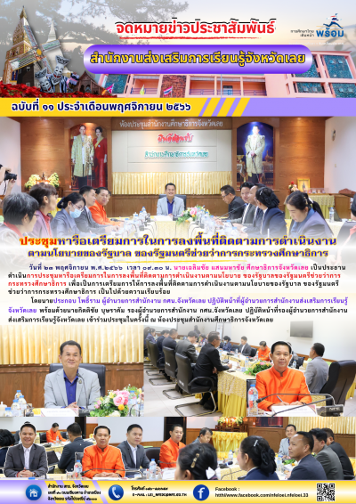 วันที่ ๒๓ พฤศจิกายน พ.ศ.๒๕๖๖ เวลา ๐๙.๓๐ น. นายเฉลิมชัย แสนมหาชัย ศึกษาธิการจังหวัดเลย เป็นประธานดำเนินการประชุมหารือเตรียมการในการลงพื้นที่ติดตามการดำเนินงานตามนโยบาย ของรัฐบาลของรัฐมนตรีช่วยว่าการกระทรวงศึกษาธิการ เพื่อเป็นการเตรียมการให้การลงพื้นที่ติดตามการดำเนินงานตามนโยบายของรัฐบาล ของรัฐมนตรีช่วยว่าการกระทรวงศึกษาธิการ เป็นไปด้วยความเรียบร้อย