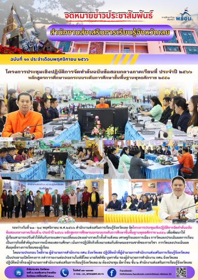 ระหว่างวันที่ ๒๓ - ๒๔ พฤศจิกายน พ.ศ.๒๕๖๖ สำนักงานส่งเสริมการเรียนรู้จังหวัดเลย จัดโครงการประชุมเชิงปฏิบัติการจัดทำต้นฉบับข้อสอบกลางภาคเรียนที่ ๒ ประจำปี ๒๕๖๖ หลักสูตรการศึกษานอกระบบระดับการศึกษาขั้นพื้นฐานพุทธศักราช ๒๕๕๑ เพื่อพัฒนาให้ผู้เรียนสามารถปรับตัวให้ทันกับกระแสความเปลี่ยนแปลงอย่างรวดเร็วทั้งด้านสังคม เศรษฐกิจและการเมือง การวัดและประเมินผลการเรียนเป็นภารกิจที่สำคัญประการหนึ่งของสถานศึกษา เน้นการปฏิบัติจริงที่เหมาะสมกับลักษณะธรรมชาติของรายวิชา การวัดและประเมินผลสัมฤทธิ์ทางการเรียนของผู้เรียน