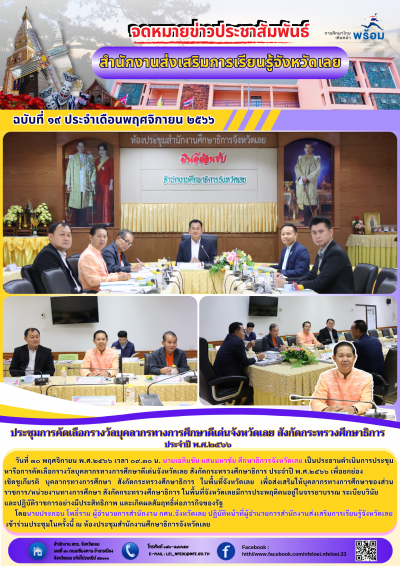 วันที่ ๓๐ พฤศจิกายน พ.ศ.๒๕๖๖ เวลา ๐๙.๓๐ น. นายเฉลิมชัย แสนมหาชัย ศึกษาธิการจังหวัดเลย เป็นประธานดำเนินการประชุมหารือการคัดเลือกรางวัลบุคลากรทางการศึกษาดีเด่นจังหวัดเลย สังกัดกระทรวงศึกษาธิการ ประจำปี พ.ศ.๒๕๖๖ เพื่อยกย่องเชิดชูเกียรติ บุคลากรทางการศึกษา สังกัดกระทรวงศึกษาธิการ ในพื้นที่จังหวัดเลย เพื่อส่งเสริมให้บุคลากรทางการศึกษาของส่วนราชการ/หน่วยงานทางการศึกษา สังกัดกระทรวงศึกษาธิการ ในพื้นที่จังหวัดเลยมีการประพฤติตนอยู่ในจรรยาบรรณ ระเบียบวินัยและปฏิบัติราชการอย่างมีประสิทธิภาพ และเกิดผลสัมฤทธิ์ต่อภารกิจของรัฐ