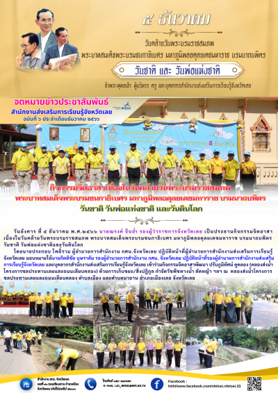 วันอังคาร ที่ ๕ ธันวาคม พ.ศ.๒๕๖๖ นายณรงค์ จีนอ่ำ รองผู้ว่าราชการจังหวัดเลย เป็นประธานกิจกรรมจิตอาสาเนื่องในวันคล้ายวันพระบรมราชสมภพ พระบาทสมเด็จพระบรมชนกาธิเบศร มหาภูมิพลอดุลยเดชมหาราช บรมนาถบพิตร วันชาติ วันพ่อแห่งชาติและวันดินโลก