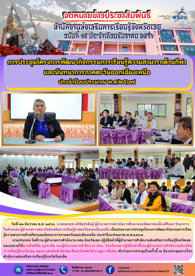 นายประกอบ โพธิ์ราม ผู้อำนวยการสำนักงาน กศน.จังหวัดเลย ปฏิบัติหน้าที่ผู้อำนวยการสำนักงานส่งเสริมการเรียนรู้จังหวัดเลย มอบหมายให้นายกิตติชัย บุษราคัม รองผู้อำนวยการสำนักงาน กศน. จังหวัดเลย ปฏิบัติหน้าที่รองผู้อำนวยการสำนักงานส่งเสริมการเรียนรู้จังหวัดเลย และนางสายันต์ คิดเข่ม ศึกษานิเทศก์ชำนาญการพิเศษ เข้าร่วมการประชุมในครั้งนี้ ณ ห้องประชุมลานไทร สำนักงานส่งเสริมการเรียนรู้จังหวัดร้อยเอ็ด