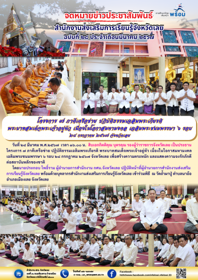 วันที่ ๒๘ มีนาคม พ.ศ.๒๕๖๗ เวลา ๑๖.๐๐ น. สิบเอกกิตติคุณ บุตรคุณ รองผู้ว่าราชการจังหวัดเลย เป็นประธานโครงการ ๗ ภาคีเครือข่าย ปฏิบัติธรรมเฉลิมพระเกียรติ พระบาทสมเด็จพระเจ้าอยู่หัว เนื่องในโอกาสมหามงคลเฉลิมพระชนมพรรษา ๖ รอบ ๒๘ กรกฎาคม ๒๕๖๗ จังหวัดเลย เพื่อสร้างความตระหนัก และแสดงความจงรักภักดีต่อสถาบันหลักของชาติ