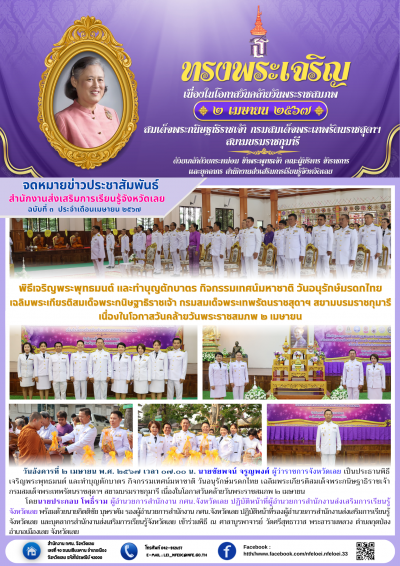 วันอังคารที่ ๒ เมษายน พ.ศ. ๒๕๖๗ เวลา ๐๗.๐๐ น. นายชัยพจน์ จรูญพงศ์ ผู้ว่าราชการจังหวัดเลย เป็นประธานพิธีเจริญพระพุทธมนต์ และทำบุญตักบาตร กิจกรรมเทศน์มหาชาติ วันอนุรักษ์มรดกไทย เฉลิมพระเกียรติสมเด็จพระกนิษฐาธิราชเจ้า กรมสมเด็จพระเทพรัตนราชสุดาฯ สยามบรมราชกุมารี เนื่องในโอกาสวันคล้ายวันพระราชสมภพ ๒ เมษายน