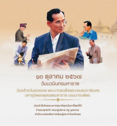 "วันนวมินทรมหาราช" 13 ตุลาคม น้อมรำลึกในพระมหากรุณาธิคุณอย่างหาที่สุดมิได้ พระบาทสมเด็จพระบรมชนกาธิเบศร มหาภูมิพลอดุลยเดชมหาราช บรมนาถบพิตร ข้าพระพุทธเจ้า ผู้บริหาร ข้าราชการ และบุคลากรในสังกัดสำนักงานส่งเสริมการเรียนรู้ประจำจังหวัดขอนแก่น