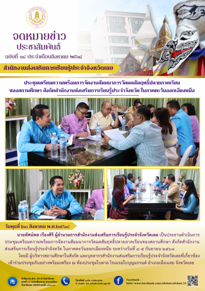 วันพุธที่ ๒๐ สิงหาคม พ.ศ.๒๕๖๘ นายทัศน์พล เรืองศิริ ผู้อำนวยการสำนักงานส่งเสริมการเรียนรู้ประจำจังหวัดเลย เป็นประธานดำเนินการประชุมเตรียมความพร้อมการจัดงานสัมมนาการวัดผลสัมฤทธิ์ปลายภาคเรียนของสถานศึกษา สังกัดสำนักงานส่งเสริมการเรียนรู้ประจำจังหวัด ในภาคตะวันออกเฉียงหนือ ระหว่างวันที่ ๔-๕ กันยายน ๒๕๖๘