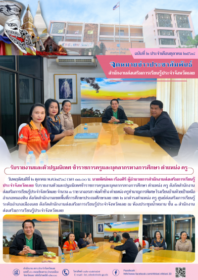 วันพฤหัสบดีที่ ๒ ตุลาคม พ.ศ.๒๕๖๘ เวลา ๑๑.๐๐ น. นายทัศน์พล เรืองศิริ ผู้อำนวยการสำนักงานส่งเสริมการเรียนรู้ประจำจังหวัดเลย รับรายงานตัวและปฐมนิเทศข้าราชการครูและบุคลากรทางการศึกษา ตำแหน่ง ครู สังกัดสำนักงานส่งเสริมการเรียนรู้ประจำจังหวัดเลย จำนวน ๑ ราย นางอรสา พ่อค้าช้าง ตำแหน่ง ครูชำนาญการพิเศษ โรงเรียนบ้านห้วยเป้าเหนืออำเภอหนองหิน สังกัดสำนักงานเขตพื้นที่การศึกษาประถมศึกษาเลย เขต ๒ มาดำรงตำแหน่ง ครู ศูนย์ส่งเสริมการเรียนรู้ระดับอำเภอเมืองเลย สังกัดสำนักงานส่งเสริมการเรียนรู้ประจำจังหวัดเลย ณ ห้องประชุมน้ำหมาน ชั้น ๑ สำนักงานส่งเสริมการเรียนรู้ประจำจังหวัดเลย