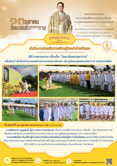 วันจันทร์ที่ ๑๓ ตุลาคม พ.ศ.๒๕๖๘ เวลา ๐๘.๐๐ น. นายชัยพจน์ จรูญพงศ์ ผู้ว่าราชการจังหวัดเลย เป็นประธานพิธีวางพวงมาลา เนื่องใน “วันนวมินทรมหาราช” เพื่อน้อมรำลึกถึงพระบาทสมเด็จพระบรมชนกาธิเบศร มหาภูมิพลอดุลยเดชมหาราช บรมนาถบพิตร
