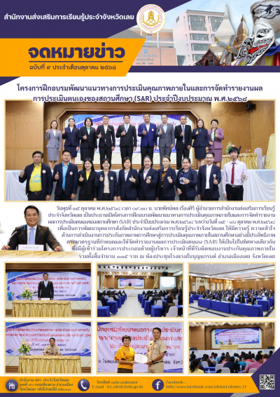 วันพุธที่ ๑๕ ตุลาคม พ.ศ.๒๕๖๘ เวลา ๐๙.๓๐ น. นายทัศน์พล เรืองศิริ ผู้อำนวยการสำนักงานส่งเสริมการเรียนรู้ประจำจังหวัดเลย เป็นประธานเปิดโครงการฝึกอบรมพัฒนาแนวทางการประเมินคุณภาพภายในและการจัดทำรายงานผลการประเมินตนเองของสถานศึกษา (SAR) ประจำปีงบประมาณ พ.ศ.๒๕๖๘ ระหว่างวันที่ ๑๕ - ๑๖ ตุลาคม พ.ศ.๒๕๖๘ เพื่อเป็นการพัฒนาบุคลากรสังกัดสำนักงานส่งเสริมการเรียนรู้ประจำจังหวัดเลย ให้มีความรู้ ความเข้าใจด้านการดำเนินงานการประกันภาพภาพการศึกษาสู่การประเมินคุณภาพภายในสถานศึกษาอย่างมีประสิทธิภาพตามมาตรฐานที่กำหนดและให้จัดทำรายงานผลการประเมินตนเอง (SAR) ให้เป็นไปในทิศทางเดียวกัน ซึ่งมีผู้เข้าร่วมโครงการประกอบด้วยผู้บริหาร เจ้าหน้าที่ที่รับผิดชอบงานประกันคุณภาพภายใน รวมทั้งสิ้นจำนวน ๑๑๕ ราย ณ ห้องประชุมโรงแรมใบบุญแกรนด์ อำเภอเมืองเลย จังหวัดเลย