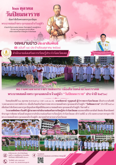 วันพฤหัสบดีที่ ๒๓ ตุลาคม พ.ศ.๒๕๖๘ เวลา ๐๗.๓๐ น. นายชัยพจน์ จรูญพงศ์ ผู้ว่าราชการจังหวัดเลย เป็นประธานในพิธีวางพวงมาลาถวายราชสักการะ เนื่องในวันคล้ายวันสวรรคต พระบาทสมเด็จพระจุลจอมเกล้าเจ้าอยู่หัว “วันปิยมหาราช” ประจำปี ๒๕๖๘ เพื่อน้อมรำลึกถึงพระมหากรุณาธิคุณอันหาที่สุดมิได้ของพระบาทสมเด็จพระจุลจอมเกล้าเจ้าอยู่หัว รัชกาลที่ ๕