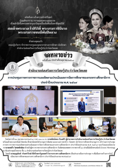 วันอังคารที่ ๒๘ ตุลาคม พ.ศ.๒๕๖๘ เวลา ๑๓.๐๐ น. นายทัศน์พล เรืองศิริ ผู้อำนวยการสำนักงานส่งเสริมการเรียนรู้ประจำจังหวัดเลย พร้อมด้วยนางสายันต์ คิดเข่ม ศึกษานิเทศก์ชำนาญการพิเศษ และนางสาวพรทิวา จันทศร นักวิชาการศึกษาชำนาญการ เข้าร่วมการประชุมการตรวจราชการและติดตามประเมินผลการจัดการศึกษาของกระทรวงศึกษาธิการ ประจำปีงบประมาณ พ.ศ. ๒๕๖๙ และรับมอบนโยบายจากนายสมใจ วิเศษทักษิณ หัวหน้าผู้ตรวจราชการกระทรวงศึกษาธิการ รับผิดชอบเขตตรวจราชการที่ ๑๐ ผ่านสื่ออิเล็กทรอนิกส์ (Zoom Meeting) ณ ห้องประชุมน้ำหมาน ชั้น ๑ สำนักงานส่งเสริมการเรียนรู้ประจำจังหวัดเลย