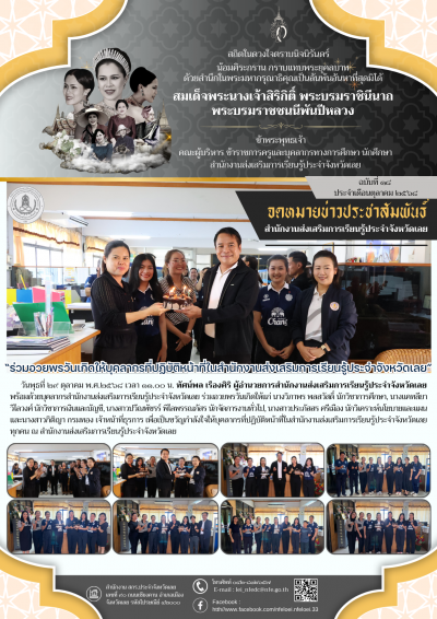วันพุธที่ ๒๙ ตุลาคม พ.ศ.๒๕๖๘ เวลา ๑๑.๐๐ น. ทัศน์พล เรืองศิริ ผู้อำนวยการสำนักงานส่งเสริมการเรียนรู้ประจำจังหวัดเลย พร้อมด้วยบุคลากรสำนักงานส่งเสริมการเรียนรู้ประจำจังหวัดเลย ร่วมอวยพรวันเกิดให้แก่ นางวิภาพร พลสวัสดิ์ นักวิชาการศึกษา, นางแคทลียา วิไลวงศ์ นักวิชาการเงินและบัญชี, นางสาวปวีณพัชรร์ พิไลพรรณภัสร นักจัดการงานทั่วไป, นางสาวประภัสสร ศรีเมือง นักวิเคราะห์นโยบายและแผน และนางสาวกิติญา กรมทอง เจ้าหน้าที่ธุรการ เพื่อเป็นขวัญกำลังใจให้บุคลากรที่ปฏิบัติหน้าที่ในสำนักงานส่งเสริมการเรียนรู้ประจำจังหวัดเลย ทุกคน ณ สำนักงานส่งเสริมการเรียนรู้ประจำจังหวัดเลย