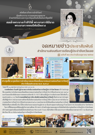 วันศุกร์ที่ ๓๑ ตุลาคม พ.ศ.๒๕๖๘ เวลา ๐๙.๐๐ น. นายทัศน์พล เรืองศิริ ผู้อำนวยการสำนักงานส่งเสริมการเรียนรู้ประจำจังหวัดเลย เข้าร่วมประชุมชี้แจงจุดเน้นการดำเนินงานเเละขับเคลื่อนงานของกรมส่งเสริมการเรียนรู้ ประจำปีงบประมาณ พ.ศ. ๒๕๖๙ และรับมอบเกียรติบัตรผลการทดสอบระดับชาติ (N-NET) มีค่าเฉลี่ยสูงกว่าระดับประเทศ ได้ลำดับที่ ๑ ของประเทศ(๖๐.๖๖) โดยมี นางเกศทิพย์ ศุภวานิช อธิบดีกรมส่งเสริมการเรียนรู้ เป็นประธานการประชุมฯ เพื่อให้ผู้บริหาร/หน่วยงานสถานศึกษาในสังกัดกรมส่งเสริมการเรียนรู้ ได้ทราบแนวทางการดำเนินงานกรมส่งเสริมการเรียนรู้ ประจำปีงบประมาณพ.ศ ๒๕๖๙ และนำแนวทางไปขับเคลื่อนงานส่งเสริมการเรียนรู้ให้เป็นไปในทางทิศเดียวกัน ทั้งในระดับส่วนกลางและส่วนภูมิภาค ณ ห้องประชุมแกรนด์บอลรูม โรงแรมเทวราช อำเภอเมืองน่าน จังหวัดน่าน