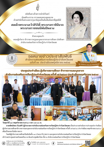 วันศุกร์ที่ ๑๔ พฤศจิกายน ๒๕๖๘ เวลา ๐๙.๐๐ น. นายทัศน์พล เรืองศิริ ผู้อำนวยการสำนักงานส่งเสริมการเรียนรู้ประจำจังหวัดเลย เป็นประธานดำเนินการประชุมประจำเดือนผู้บริหารสถานศึกษาข้าราชการและบุคลากรสำนักงานส่งเสริมการเรียนรู้ประจำจังหวัดเลย ครั้งที่ ๗/๒๕๖๘ ประจำเดือน พฤศจิกายน ๒๕๖๘ เพื่อปรึกษาหารือข้อราชการ