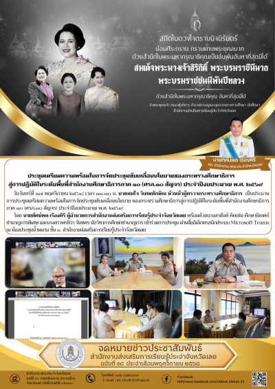 โดย นายทัศน์พล เรืองศิริ ผู้อำนวยการสำนักงานส่งเสริมการเรียนรู้ประจำจังหวัดเลย พร้อมด้วยนางสายันต์ คิดเข่ม ศึกษานิเทศก์ชำนาญการพิเศษ และนางสาวพรทิวา จันทศร นักวิชาการศึกษาชำนาญการ เข้าร่วมการประชุม ผ่านสื่ออิเล็กทรอนิกส์ระบบ Microsoft Teams ณ ห้องประชุมน้ำหมาน ชั้น ๑ สำนักงานส่งเสริมการเรียนรู้ประจำจังหวัดเลย