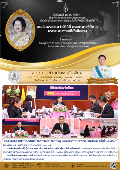 วันอังคารที่ ๒๕ พฤศจิกายน พ.ศ.๒๕๖๘ เวลา ๑๓.๐๐ น. นายทัศน์พล เรืองศิริ ผู้อำนวยการสำนักงานส่งเสริมการเรียนรู้ประจำจังหวัดเลย เข้าร่วมประชุมคณะกรรมการส่งเสริมสวัสดิการและสวัสดิภาพครูและบุคลากรทางการศึกษาจังหวัดเลย ครั้งที่ ๒/๒๕๖๙ เพื่อพิจารณาให้ทุนการศึกษามูลนิธิทวี บุณยเกตุ ประจำปี ๒๕๖๘