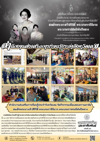นายทัศน์พล เรืองศิริ ผู้อำนวยการสำนักงานส่งเสริมการเรียนรู้ประจำจังหวัดเลย มอบหมายให้สถานศึกษาในสังกัด ทั้ง ๑๔ แห่ง จัดกิจกรรมเพื่อแสดงความอาลัย สมเด็จพระนางเจ้าสิริกิติ์ พระบรมราชินีนาถ พระบรมราชชนนีพันปีหลวง ประกอบด้วย กิจกรรมลงนามถวายความอาลัย, กิจกรรมทำโบว์ริบบิ้นสีดำไว้อาลัย, นิทรรศการ “พระราชประวัติและพระราชกรณียกิจของสมเด็จพระนางเจ้าสิริกิติ์ พระบรมราชินีนาถ พระบรมราชชนนีพันปีหลวง”, กิจกรรมส่งเสริมการอ่านออนไลน์เรื่อง “พระราชประวัติและพระราชกรณียกิจของสมเด็จพระนางเจ้าสิริกิติ์ พระบรมราชินีนาถ พระบรมราชชนนีพันปีหลวง” และกิจกรรมส่งเสริมการอ่านออนไลน์ เรื่องแนวทางปฏิบัติเกี่ยวกับการถวายอาลัยและการแต่งกายไว้ทุกข์ ระหว่างวันที่ ๒๕ ตุลาคม - ๒๘ พฤศจิกายน ๒๕๖๘ ซึ่งเป็นการแสดงออกถึงความอาลัยและรำลึกถึงพระมหากรุณาธิคุณสมเด็จพระนางเจ้าสิริกิติ์ พระบรมราชินีนาถ พระบรมราชชนนีพันปีหลวง