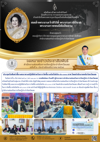 วันอังคารที่ ๒ ธันวาคม ๒๕๖๘ เวลา ๑๓.๓๐ น. นายทัศน์พล เรืองศิริ ผู้อำนวยการสำนักงานส่งเสริมการเรียนรู้ประจำจังหวัดเลย พร้อมด้วยหัวหน้ากลุ่มงาน เจ้าหน้าที่การเงิน บัญชี พัสดุ และตรวจสอบภายในสำนักงานส่งเสริมการเรียนรู้ประจำจังหวัดเลย เข้าร่วมประชุมรับฟังคำชี้แจงแนวทางปฏิบัติสำหรับการจัดซื้อวงเงินไม่เกิน ๕๐,๐๐๐ บาท โดยสำนักงานคลังจังหวัดเลย เพื่อสร้างความรู้ ความเข้าใจในการจัดซื้อวงงินไม่เกิน ๕๐,๐๐๐ บาท แก่เจ้าหน้าที่ผู้ปฏิบัติงาน ผ่านระบบ Online microsoft team ณ ห้องประชุมผีตาโขน ชั้น ๒ สำนักงานส่งเสริมการเรียนรู้ประจำจังหวัดเลย