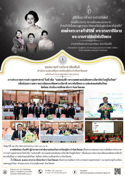 วันศุกร์ที่ ๑๒ ธันวาคม พ.ศ.๒๕๖๘ เวลา ๐๙.๐๐ น. นายทัศน์พล เรืองศิริ ผู้อำนวยการสำนักงานส่งเสริมการเรียนรู้ประจำจังหวัดเลย เป็นประธานคณะกรรมการตัดสินการประกวดการกล่าวสุนทรพจน์ ในหัวข้อ "แม่แห่งฟ้า พระเมตตาแห่งดินพระเกียรติถวิลคู่ถิ่นไทย" เพื่อน้อมถวายความอาลัยและเทิดพระเกียรติ พระพันปีหลวง แม่แห่งแผ่นดินไทย จัดโดย สำนักงานศึกษาธิการจังหวัดเลย