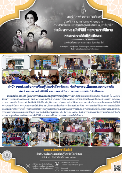 นายทัศน์พล เรืองศิริ ผู้อำนวยการสำนักงานส่งเสริมการเรียนรู้ประจำจังหวัดเลย มอบหมายให้สถานศึกษาในสังกัด ทั้ง ๑๔ แห่ง จัดกิจกรรมเพื่อแสดงความอาลัย สมเด็จพระนางเจ้าสิริกิติ์ พระบรมราชินีนาถ พระบรมราชชนนีพันปีหลวง ประกอบด้วย กิจกรรมลงนามถวายความอาลัย, กิจกรรมทำโบว์ริบบิ้นสีดำไว้อาลัย, นิทรรศการ “พระราชประวัติและพระราชกรณียกิจของสมเด็จพระนางเจ้าสิริกิติ์ พระบรมราชินีนาถ พระบรมราชชนนีพันปีหลวง”, กิจกรรมส่งเสริมการอ่านออนไลน์เรื่อง “พระราชประวัติและพระราชกรณียกิจของสมเด็จพระนางเจ้าสิริกิติ์ พระบรมราชินีนาถ พระบรมราชชนนีพันปีหลวง” และกิจกรรมส่งเสริมการอ่านออนไลน์ เรื่องแนวทางปฏิบัติเกี่ยวกับการถวายอาลัยและการแต่งกายไว้ทุกข์ ระหว่างวันที่ ๒๕ ตุลาคม - ๑๒ ธันวาคม ๒๕๖๘ ซึ่งเป็นการแสดงออกถึงความอาลัยและรำลึกถึงพระมหากรุณาธิคุณ สมเด็จพระนางเจ้าสิริกิติ์ พระบรมราชินีนาถ พระบรมราชชนนีพันปีหลวง
