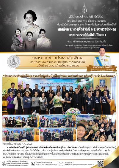 วันพุธที่ ๒๔ ธันวาคม พ.ศ.๒๕๖๘ นายทัศน์พล เรืองศิริ ผู้อำนวยการสำนักงานส่งเสริมการเรียนรู้ประจำจังหวัดเลย พร้อมด้วยบุคลากรสำนักงานส่งเสริมการเรียนรู้ประจำจังหวัดเลย ร่วมอวยพรวันเกิดให้แก่ ว่าที่ ร.ต.หญิงอัจฉรา หลักทรัพย์ นักวิชาการพัสดุ และนางสาววีรภัทรา กตะศิลา พนักงานจ้างเหมาบริการ เพื่อเป็นขวัญกำลังใจให้บุคลากรที่ปฏิบัติหน้าที่ในสำนักงานส่งเสริมการเรียนรู้ประจำจังหวัดเลยทุกคน ณ สำนักงานส่งเสริมการเรียนรู้ประจำจังหวัดเลย