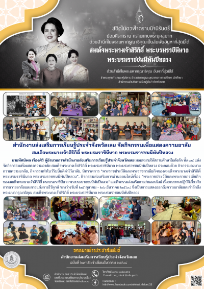 นายทัศน์พล เรืองศิริ ผู้อำนวยการสำนักงานส่งเสริมการเรียนรู้ประจำจังหวัดเลย มอบหมายให้สถานศึกษาในสังกัด ทั้ง ๑๔ แห่ง จัดกิจกรรมเพื่อแสดงความอาลัย สมเด็จพระนางเจ้าสิริกิติ์ พระบรมราชินีนาถ พระบรมราชชนนีพันปีหลวง ประกอบด้วย กิจกรรมลงนามถวายความอาลัย, กิจกรรมทำโบว์ริบบิ้นสีดำไว้อาลัย, นิทรรศการ “พระราชประวัติและพระราชกรณียกิจของสมเด็จพระนางเจ้าสิริกิติ์ พระบรมราชินีนาถ พระบรมราชชนนีพันปีหลวง”, กิจกรรมส่งเสริมการอ่านออนไลน์เรื่อง “พระราชประวัติและพระราชกรณียกิจ ของสมเด็จพระนางเจ้าสิริกิติ์ พระบรมราชินีนาถ พระบรมราชชนนีพันปีหลวง” และกิจกรรมส่งเสริมการอ่านออนไลน์ เรื่องแนวทางปฏิบัติเกี่ยวกับการถวายอาลัยและการแต่งกายไว้ทุกข์ ระหว่างวันที่ ๒๕ ตุลาคม - ๒๖ ธันวาคม ๒๕๖๘ ซึ่งเป็นการแสดงออกถึงความอาลัยและรำลึกถึงพระมหากรุณาธิคุณ สมเด็จพระนางเจ้าสิริกิติ์ พระบรมราชินีนาถ พระบรมราชชนนีพันปีหลวง