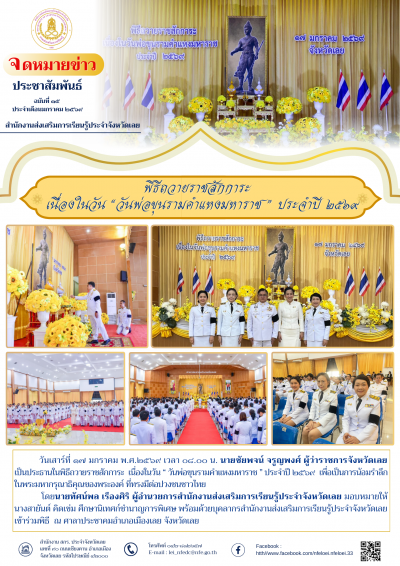 วันเสาร์ที่ ๑๗ มกราคม พ.ศ.๒๕๖๙ เวลา ๐๘.๐๐ น. นายชัยพจน์ จรูญพงศ์ ผู้ว่าราชการจังหวัดเลย เป็นประธานในพิธีถวายราชสักการะ เนื่องในวัน “ วันพ่อขุนรามคำแหงมหาราช ” ประจำปี ๒๕๖๙ เพื่อเป็นการน้อมรำลึกในพระมหากรุณาธิคุณของพระองค์ ที่ทรงมีต่อปวงชนชาวไทย