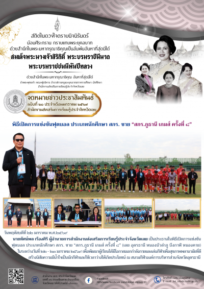 วันพฤหัสบดีที่ ๒๒ มกราคม พ.ศ.๒๕๖๙ นายทัศน์พล เรืองศิริ ผู้อำนวยการสำนักงานส่งเสริมการเรียนรู้ประจำจังหวัดเลย เป็นประธานในพิธีเปิดการแข่งขันฟุตบอล ประเภทนักศึกษา สกร. ชาย “สกร.ภูธานี เกมส์ ครั้งที่ ๘” (เลย อุดรธานี หนองบัวลำภู บึงกาฬ หนองคาย) ในระหว่างวันที่ ๒๒ - ๒๓ มกราคม ๒๕๖๙ เพื่อพัฒนาผู้เรียนได้มีโอกาสออกกำลังกายและเล่นกีฬาเพื่อสุขภาพพลานามัยที่ดี สร้างนิสัยความมีน้ำใจเป็นนักกีฬาและใช้เวลาว่างให้เกิดประโยชน์ ณ สนามกีฬาองค์การบริหารส่วนจังหวัดอุดรธานี