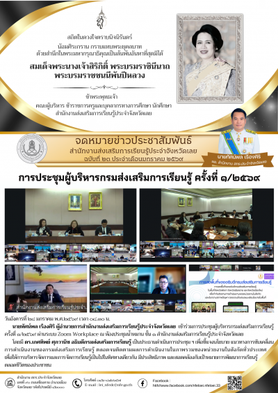 วันอังคารที่ ๒๗ มกราคม พ.ศ.๒๕๖๙ เวลา ๐๘.๓๐ น. นายทัศน์พล เรืองศิริ ผู้อำนวยการสำนักงานส่งเสริมการเรียนรู้ประจำจังหวัดเลย เข้าร่วมการประชุมผู้บริหารกรมส่งเสริมการเรียนรู้ ครั้งที่ ๑/๒๕๖๙ ผ่านระบบ Zoom Workplace ณ ห้องประชุมน้ำหมาน ชั้น ๑ สำนักงานส่งเสริมการเรียนรู้ประจำจังหวัดเลย
