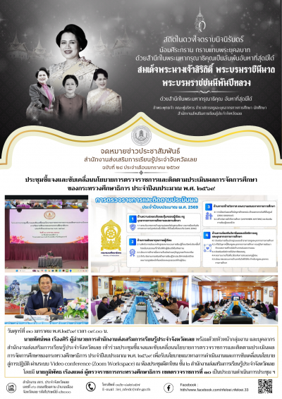 วันศุกร์ที่ ๓๐ มกราคม พ.ศ.๒๕๖๙ เวลา ๐๙.๐๐ น. นายทัศน์พล เรืองศิริ ผู้อำนวยการสำนักงานส่งเสริมการเรียนรู้ประจำจังหวัดเลย พร้อมด้วยหัวหน้ากลุ่มงาน และบุคลากรสำนักงานส่งเสริมการเรียนรู้ประจำจังหวัดเลย เข้าร่วมประชุมชี้แจงและขับเคลื่อนนโยบายการตรวจราชการและติดตามประเมินผลการจัดการศึกษาของกระทรวงศึกษาธิการ ประจำปีงบประมาณ พ.ศ. ๒๕๖๙ เพื่อรับนโยบายแนวทางการดำเนินงานและการขับเคลื่อนนโยบายสู่การปฎิบัติ ผ่านระบบ Video conference (Zoom Workspace) ณ ห้องประชุมผีตาโขน ชั้น ๒ สำนักงานส่งเสริมการเรียนรู้ประจำจังหวัดเลย โดยมี นายภูมิพัทธ เรืองแหล่ ผู้ตรวจราชการกระทรวงศึกษาธิการ เขตตรวจราชการที่ ๑๐ เป็นประธานดำเนินการประชุม ฯ