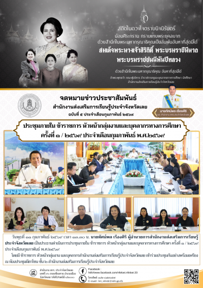 วันพุธที่ ๑๑ กุมภาพันธ์ ๒๕๖๙ เวลา ๑๓.๓๐ น. นายทัศน์พล เรืองศิริ ผู้อำนวยการสำนักงานส่งเสริมการเรียนรู้ประจำจังหวัดเลย เป็นประธานดำเนินการประชุมภายใน ข้าราชการ หัวหน้ากลุ่มงานและบุคลากรทางการศึกษา ครั้งที่ ๑ / ๒๕๖๙ ประจำเดือนกุมภาพันธ์ พ.ศ.๒๕๖๙โดยมี ข้าราชการ หัวหน้ากลุ่มงาน และบุคลากรสำนักงานส่งเสริมการเรียนรู้ประจำจังหวัดเลย เข้าร่วมประชุมกันอย่างพร้อมเพรียงณ ห้องประชุมผีตาโขน ชั้น ๒ สำนักงานส่งเสริมการเรียนรู้ประจำจังหวัดเลย