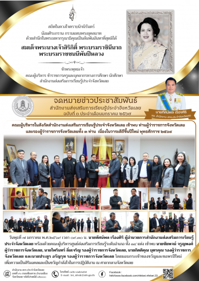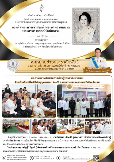 ทรงพระเจริญ ๘ มกราคม ๒๕๖๙ เนื่องในวันคล้ายวันประสูติ สมเด็จพระเจ้าลูกเธอ เจ้าฟ้าสิริวัณณวรี นารีรัตนราชกัญญา **** ด้วยเกล้าด้วยกระหม่อม ขอเดชะ ข้าพระพุทธเจ้า คณะผู้บริหาร ข้าราชการครูและบุคลากร สำนักงานส่งเสริมการเรียนรู้ประจำจังหวัดเลย