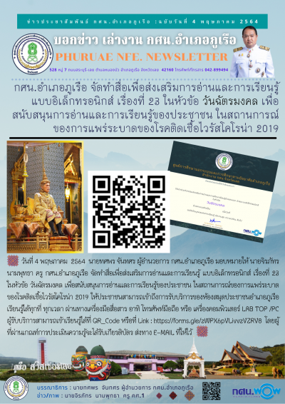 กศน.อำเภอภูเรือ จัดทำสื่อเพื่อส่งเสริมการอ่านและการเรียนรู้ แบบอิเล็กทรอนิกส์ เรื่องที่ 23 ในหัวข้อ วันฉัตรมงคล เพื่อสนับสนุนการอ่านและการเรียนรู้ของประชาชน ในสถานการณ์ของการแพร่ระบาดของโรคติดเชื้อไวรัสโคโรน่า 2019