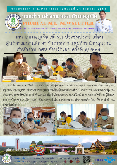 กศน.อำเภอภูเรือ เข้าร่วมการประชุมประจำเดือนผู้บริหารสถานศึกษา ข้าราชการ และหัวหน้ากลุ่มงาน สำนักงาน กศน.จังหวัดเลย ครั้งที่ 3/2564 ประจำเดือนเมษายน 2564