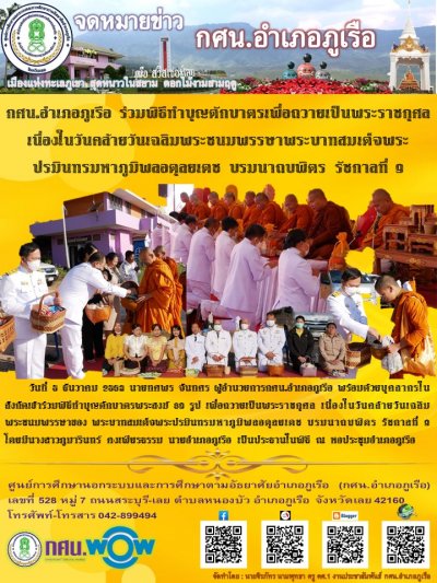 กศน.อำเภอภูเรือ ร่วมพิธีทำบุญตักบาตรเพื่อถวายเป็นพระราชกุศล เนื่องในวันคล้ายวันเฉลิมพระชนมพรรษาพระบาทสมเด็จพระปรมินทรมหาภูมิพลอดุลยเดช บรมนาถบพิตร รัชกาลที่ 9
