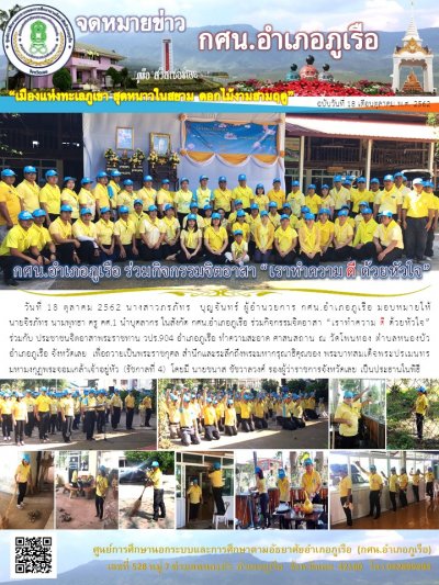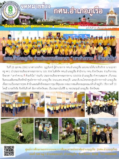 ประชาชนจิตอาสาพระราชทาน วปร. 904 ในสังกัด กศน.อำเภอภูเรือ สำนักงาน กศน.จังหวัดเลย ร่วมกิจกรรมจิตอาสา “เราทำความ ดี ด้วยหัวใจ” เพื่อถวายเป็นพระราชกุศล สำนึกและระลึกถึงพระมหากรุณาธิคุณของ พระบาทสมเด็จพระจุลจอมเกล้าเจ้าอยู่หัว (รัชกาลที่ 5)