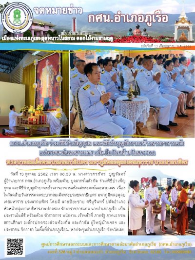 กศน.อำเภอภูเรือ ร่วมพิธีบำเพ็ญกุศล และพิธีทำบุญตักบาตรข้าวสารอาหารแห้งแด่พระสงฆ์และสามเณร เนื่องในวันคล้ายวันสวรรคตพระบาทสมเด็จพระบรมชนกาธิเบศร มหาภูมิพลอดุลยเดชมหาราช บรมนาถบพิตร