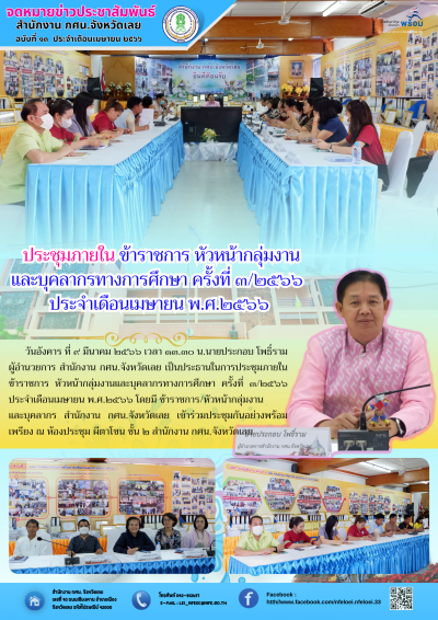 ประชุมภายใน ข้าราชการ หัวหน้ากลุ่มงานและบุคลากรทางการศึกษา ครั้งที่ ๓/๒๕๖๖ ประจำเดือนเมษายน พ.ศ.๒๕๖๖