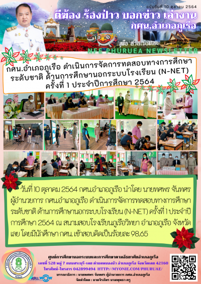 กศน.อำเภอภูเรือ ดำเนินการจัดการทดสอบทางการศึกษาระดับชาติ ด้านการศึกษานอกระบบโรงเรียน (N-NET) ครั้งที่ 1 ประจำปีการศึกษา 2564