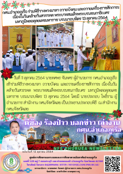 กศน.อำเภอภูเรือ ร่วมพิธีวางพวงมาลา ถวายบังคม และถวายเครื่องราชสักการะ เนื่องในวันคล้ายวันสวรรคต พระบาทสมเด็จพระบรมชนกาธิเบศร มหาภูมิพลอดุลยเดชมหาราช บรมนาถบพิตร 13 ตุลาคม 2564