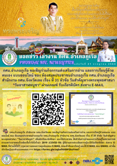 หัวข้อข่าว : กศน.อำเภอภูเรือ ขอเชิญร่วมกิจกรรมส่งเสริมการอ่าน และการเรียนรู้ด้วยตนเอง แบบออนไลน์ ของ ห้องสมุดประชาชนอำเภอภูเรือ กศน.อำเภอภูเรือ สำนักงาน กศน.จังหวัดเลย เรื่อง ที่ 31 หัวข้อ วันสำคัญทางพระพุทธศาสนา "วันอาสาฬหบูชา" ผ่านเกณฑ์ รับเกียรติบัตร ส่งทาง E-MAIL