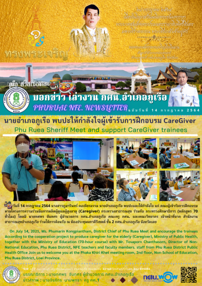 หัวข้อข่าว : นายอำเภอภูเรือ พบปะให้กำลังใจผู้เข้ารับการฝึกอบรม CareGiver จัดโดย กศน.อำเภอภูเรือ และ สำนักงานสาธารณสุขอำเภอภูเรือ Phu Ruea Sheriff Meet and support CareGiver trainees